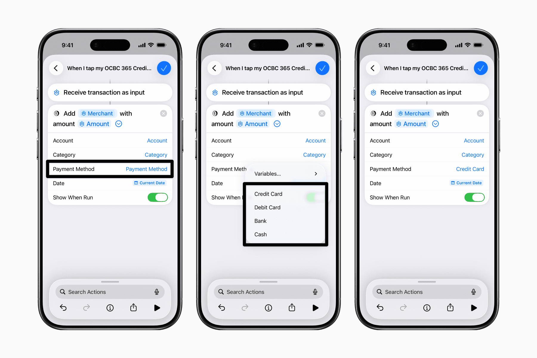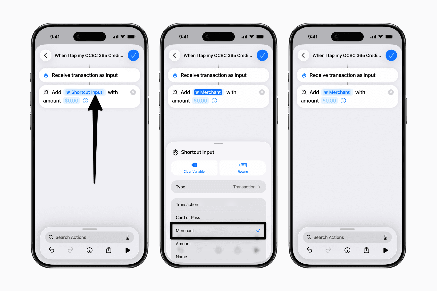 Then tap the Shortcut Input variable in the Title field and select the specific transaction detail to extract, which will be Merchant.