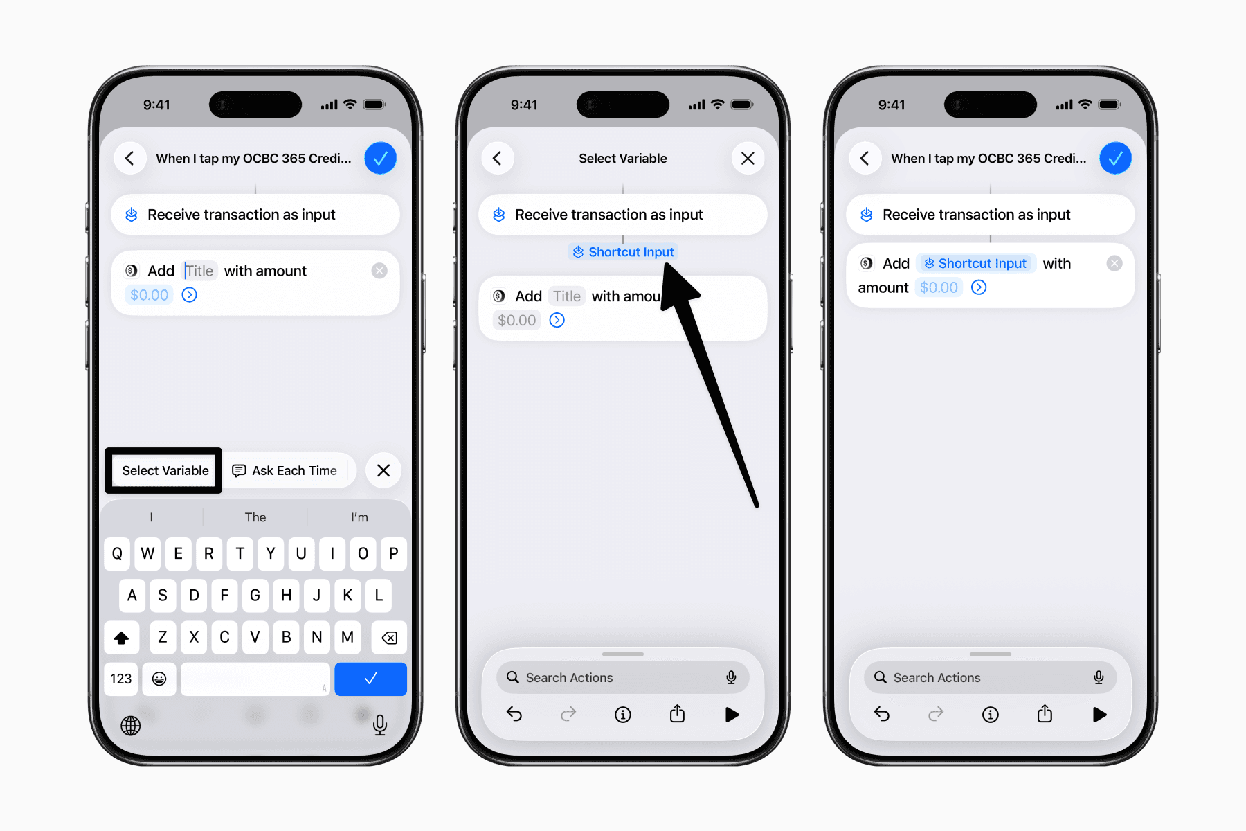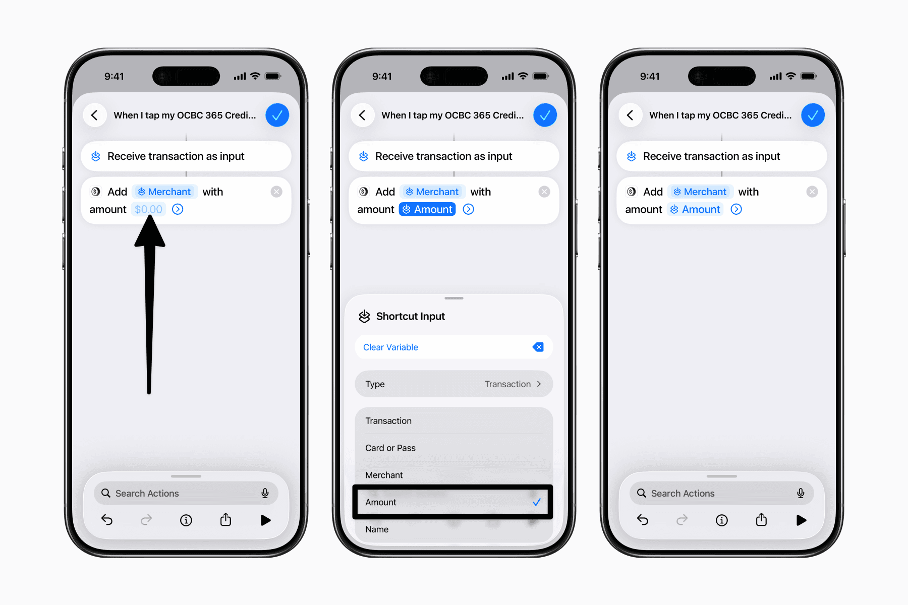 Next, for the Amount field, again tap “Select Variable”, choose “Shortcut Input,” and then tap the variable. This time, select Amount as the detail to extract from the transaction.